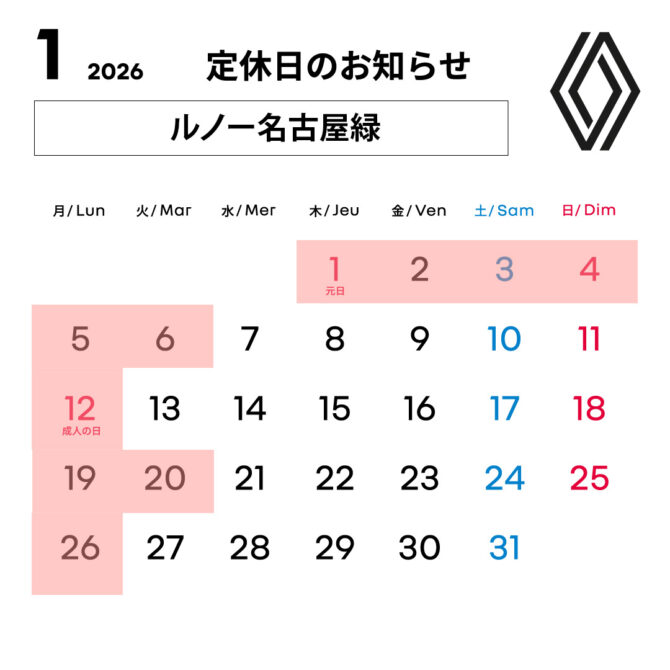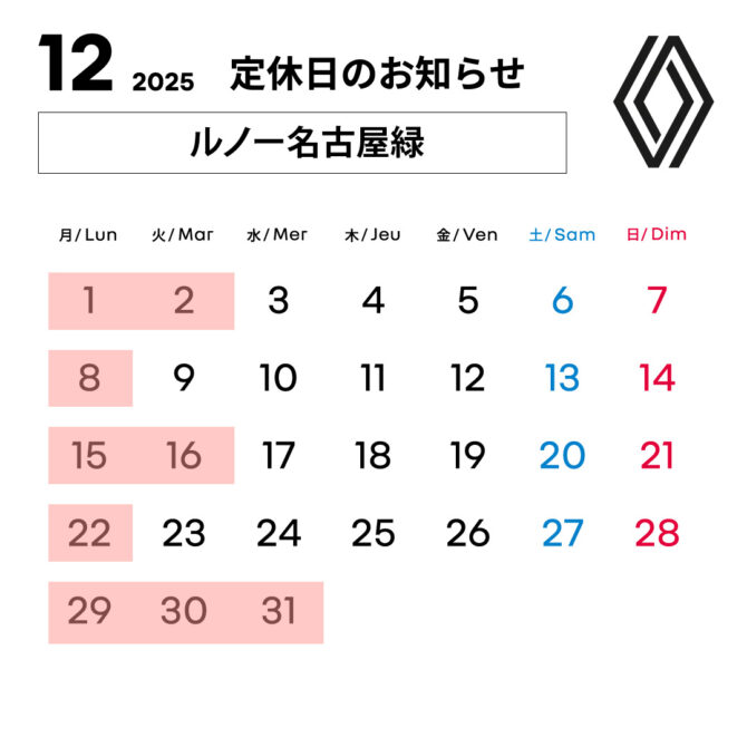 日頃は、ルノー名古屋緑をご愛顧いただき誠にありがとうございます。12月・1月の営業日については以下とさせていただきます。